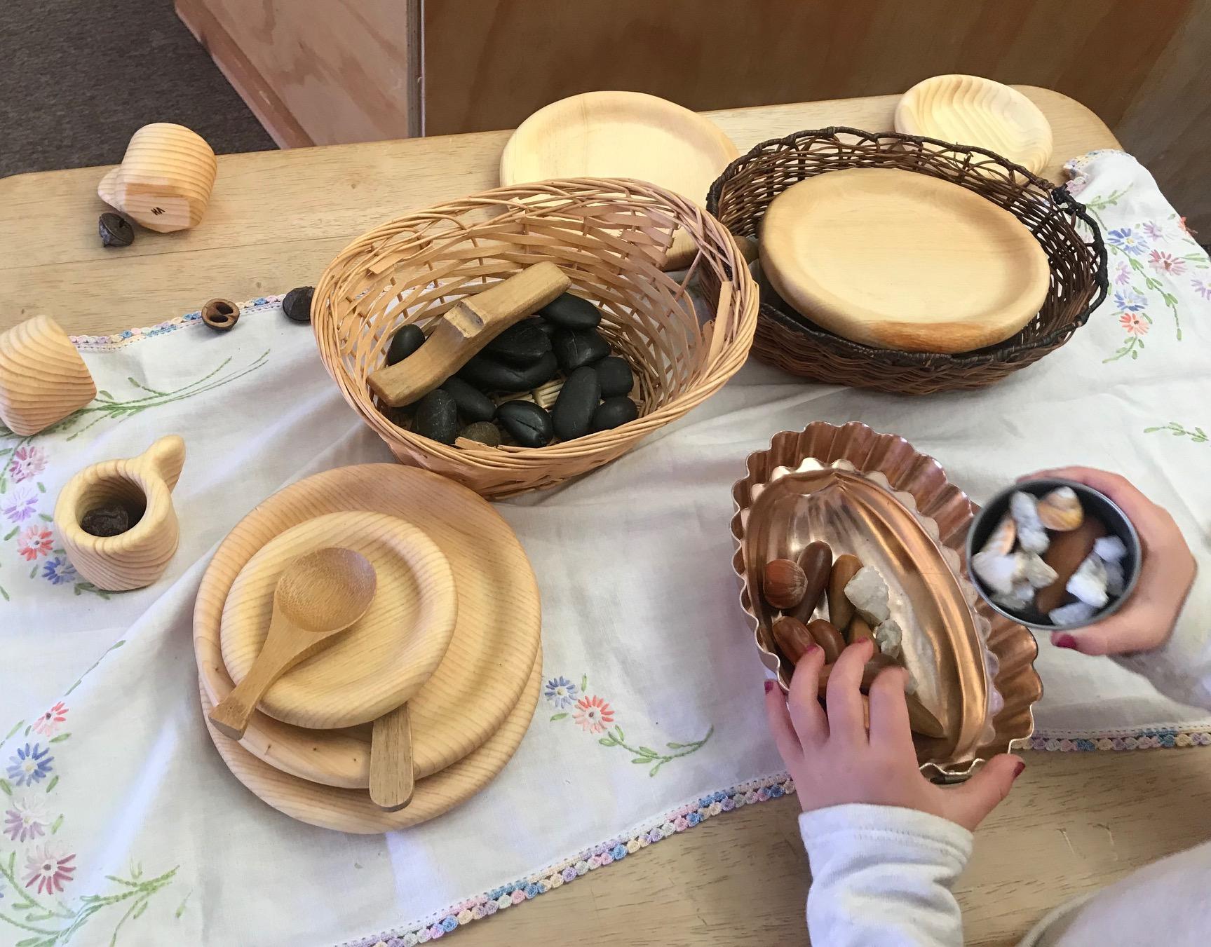 Early Childhood classrooms are designed as joyful, nurturing spaces with natural, open-ended materials—such as wooden toys, shells, stones, cloth dolls, and play silks that encourage imagination, sensory development, and healthy motor skills.