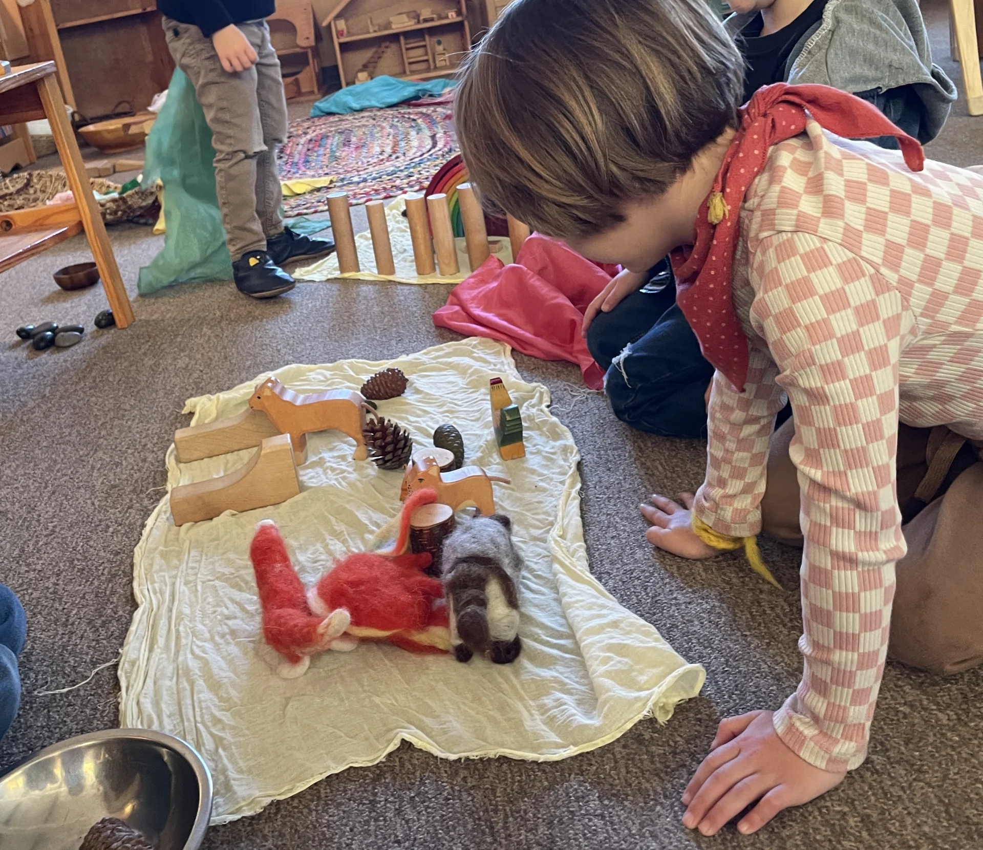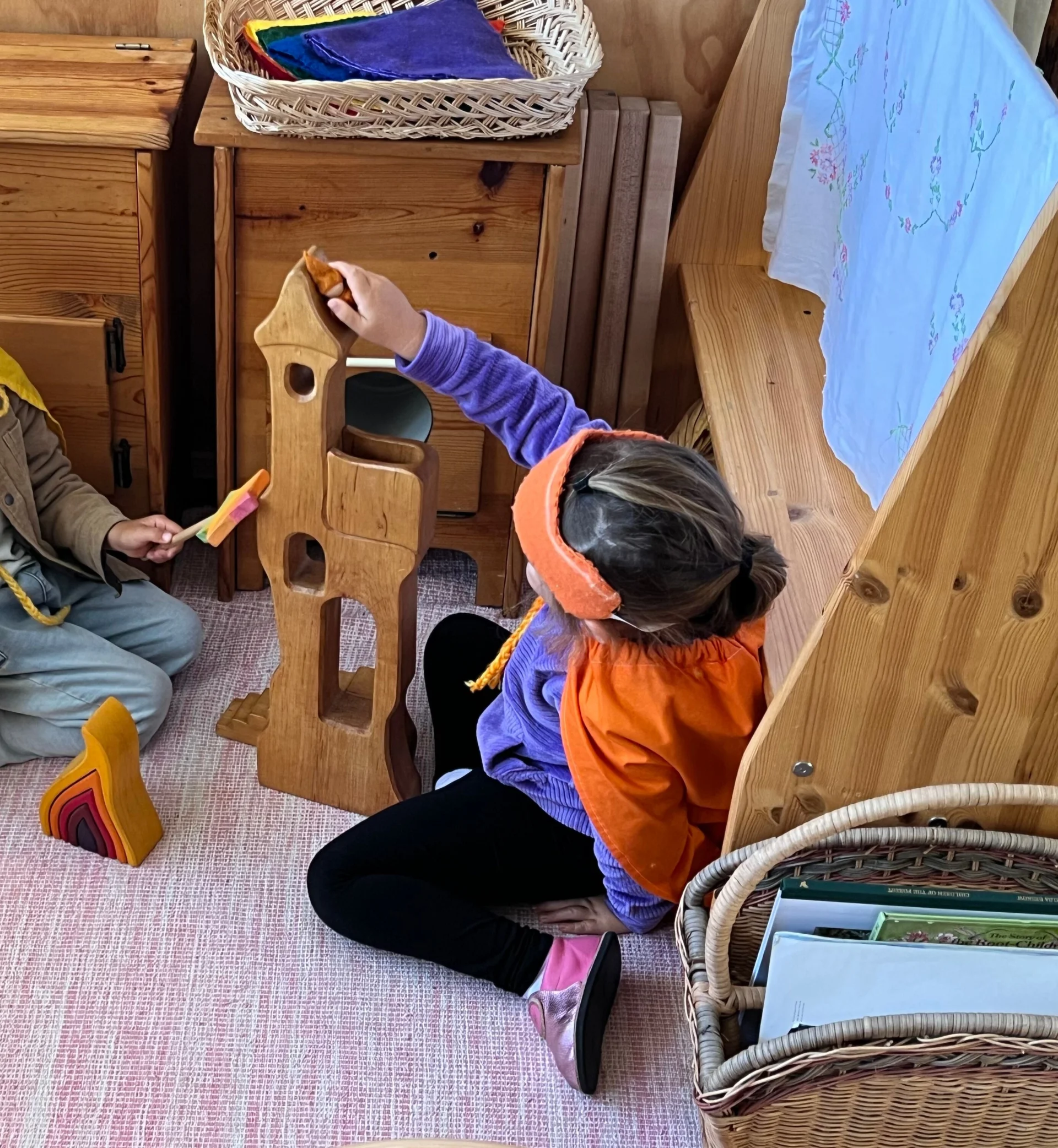Our Early Childhood classrooms offer a joyful, nurturing setting that inspires the imagination, respects nature, and honors play. The “magic” of childhood is preserved through an atmosphere of beauty and wonder. The classroom is set up to encourage imaginative play and allow the child full reign of creative and individualistic expression. Open-ended toys and equipment of natural materials are provided to best stimulate the child’s senses and imagination. These classroom objects include: basic blocks, things gathered from nature (shells, acorns, stones, etc.), wooden toys (play kitchen, boat, animals), soft knit animals, cloth dolls, play silks, dress-ups and more. These simple materials are chosen to allow the small and large motor skills to develop organically, thus laying the foundation for later academic learning.
