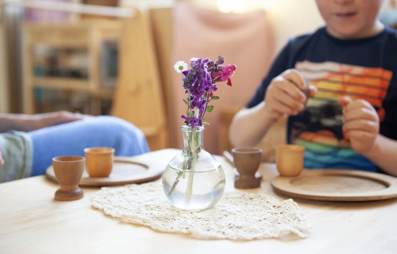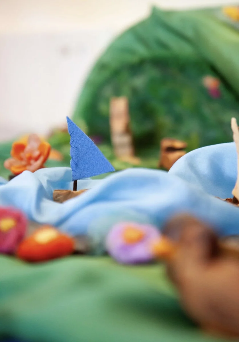 Early Childhood classrooms are designed as joyful, nurturing spaces with natural, open-ended materials—such as wooden toys, shells, stones, cloth dolls, and play silks that encourage imagination, sensory development, and healthy motor skills.